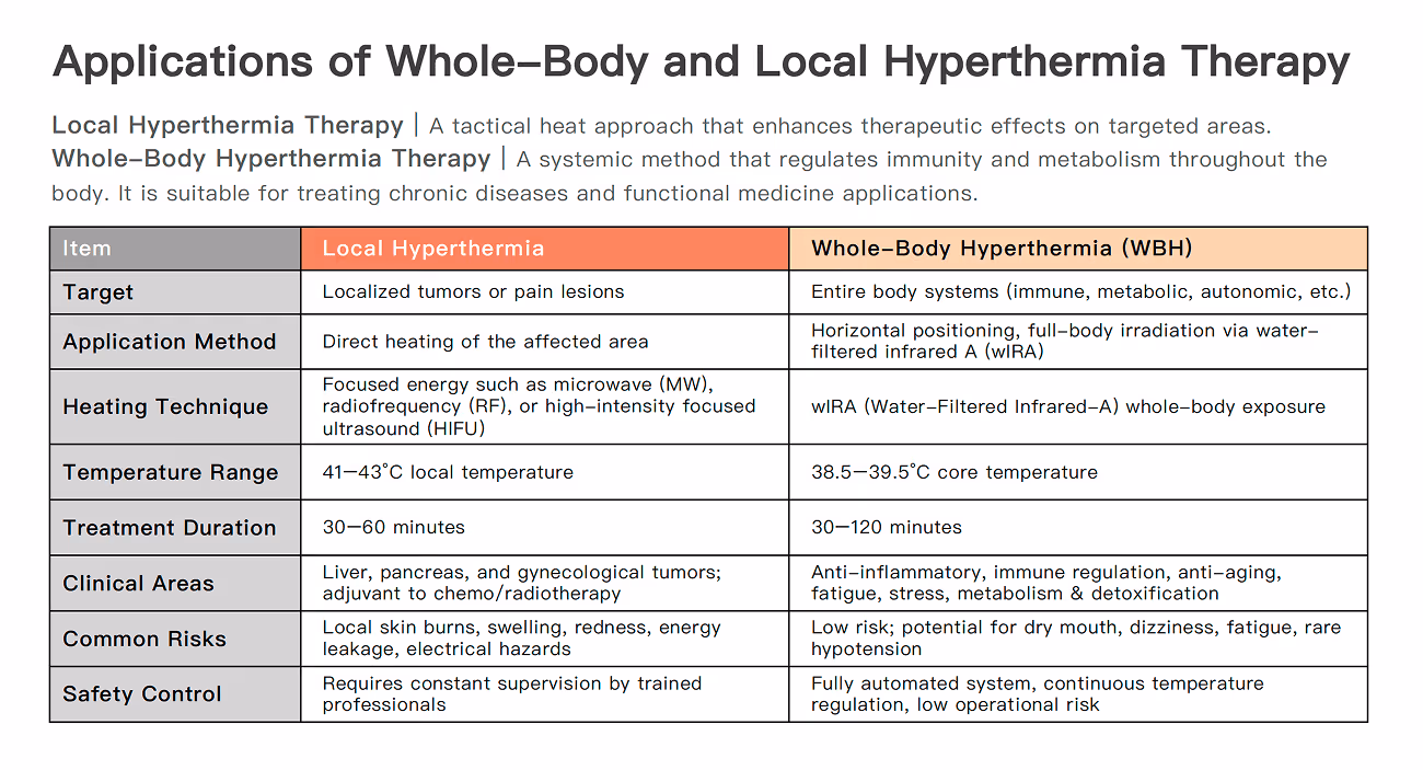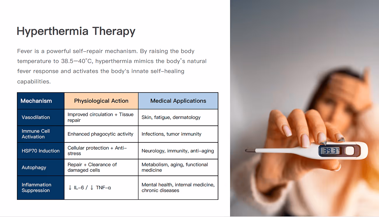 Hyperthermia Treatment gently warms your body to around 38.5–39.5°C, similar to a natural fever. This mild, safe heat: